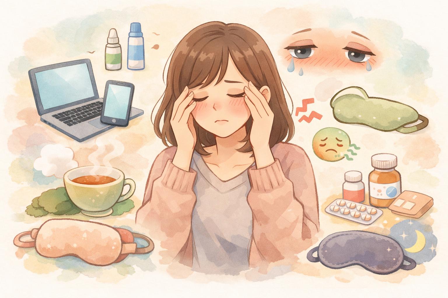 「目の奥が重い」「頭痛や吐き気が止まらない」そのつらい症状、もしかしたら単なる疲れではない「眼精疲労」が原因かもしれません。本記事は医師監修のもと、眼精疲労と目の疲れの違いから、なぜ頭痛や吐き気を引き起こすのか、そのメカニズムを徹底解説します。長時間のデジタルデバイス使用やドライアイ、ストレスなど、あなたの眼精疲労の根本原因を特定し、今日から実践できる目のストレッチや温め方、正しい目薬の選び方といったセルフケア術を詳しくご紹介。さらに、睡眠の質向上や食生活の見直し、ブルーライト対策など、根本から眼精疲労を改善・予防する生活習慣の全知識を網羅しています。この記事を読めば、あなたのつらい症状の原因が分かり、快適な毎日を取り戻すための具体的な方法が見つかるでしょう。